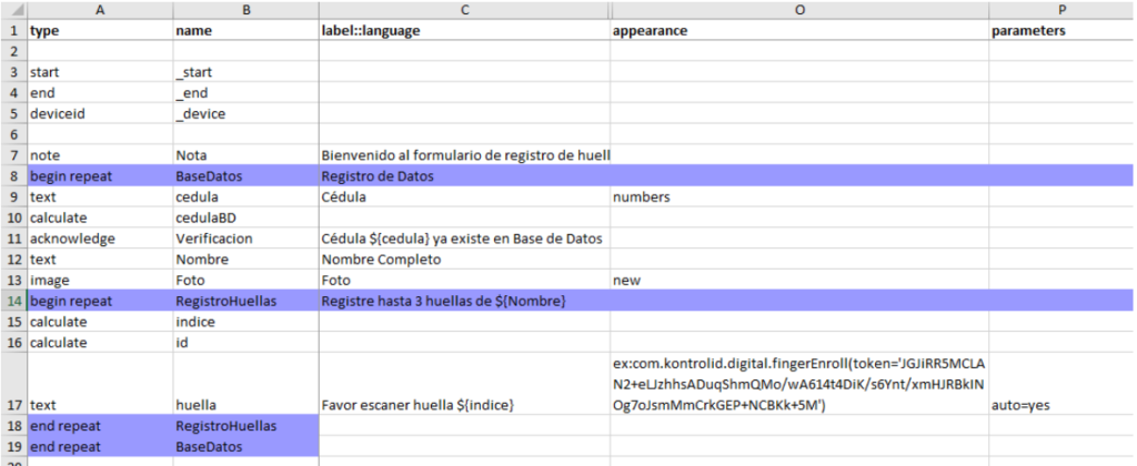 El formulario se puede sofisticar aún más para hacer validaciones de cédulas o permitir más de una huella por cédula. En el ejemplo de abajo se usan dos grupos de repetición anidados. El externo maneja el registro de personas múltiple y el interno, el registro de múltiples huellas por persona. Se parametrizó el conteo a 3 para obligar a 3 huellas: