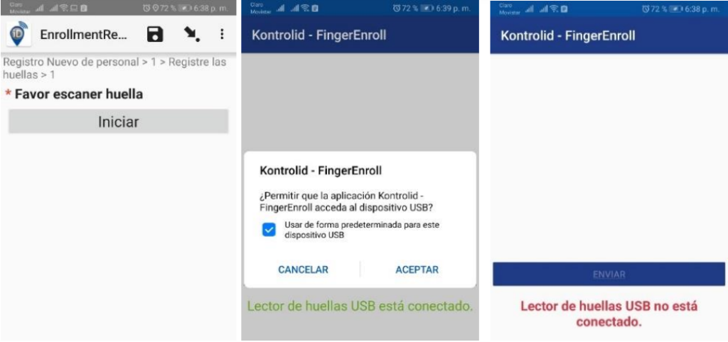 Podrá iniciar la lectura de huella y enviar la información a Kontrolid.